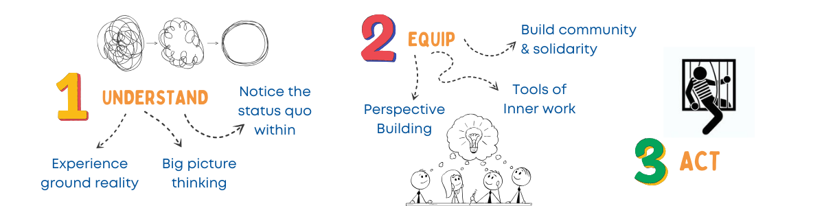 Our flagship immersive journeys Gramya Manthan & Earth Shastra do just this! Young People are initiated into an exploration to 'Understand' and be equipped with tools to respond. They then Act in their communities,with an understanding of the context & the consequences.